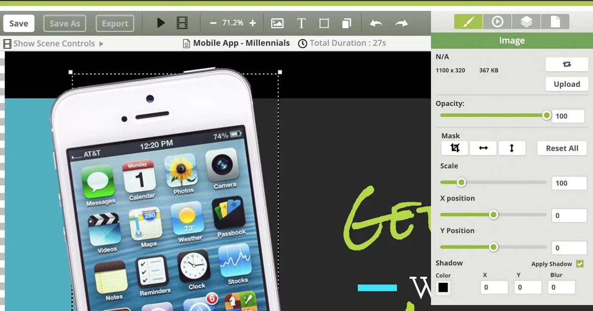 Directly under the Toolbar is a small Title Bar showing the name of the file and the total duration in seconds. To the left of the title is a clickable “Show Scene Controls” that reveals the scenes with buttons for adding or duplicating scenes and changing the duration of the highlighted scene. If more scenes are added then can fit on the screen a horizontal scrollbar is triggered. Being able to Show and Hide the scene controls opens up valuable screen space for the design canvas, which is where users spend most of their time.